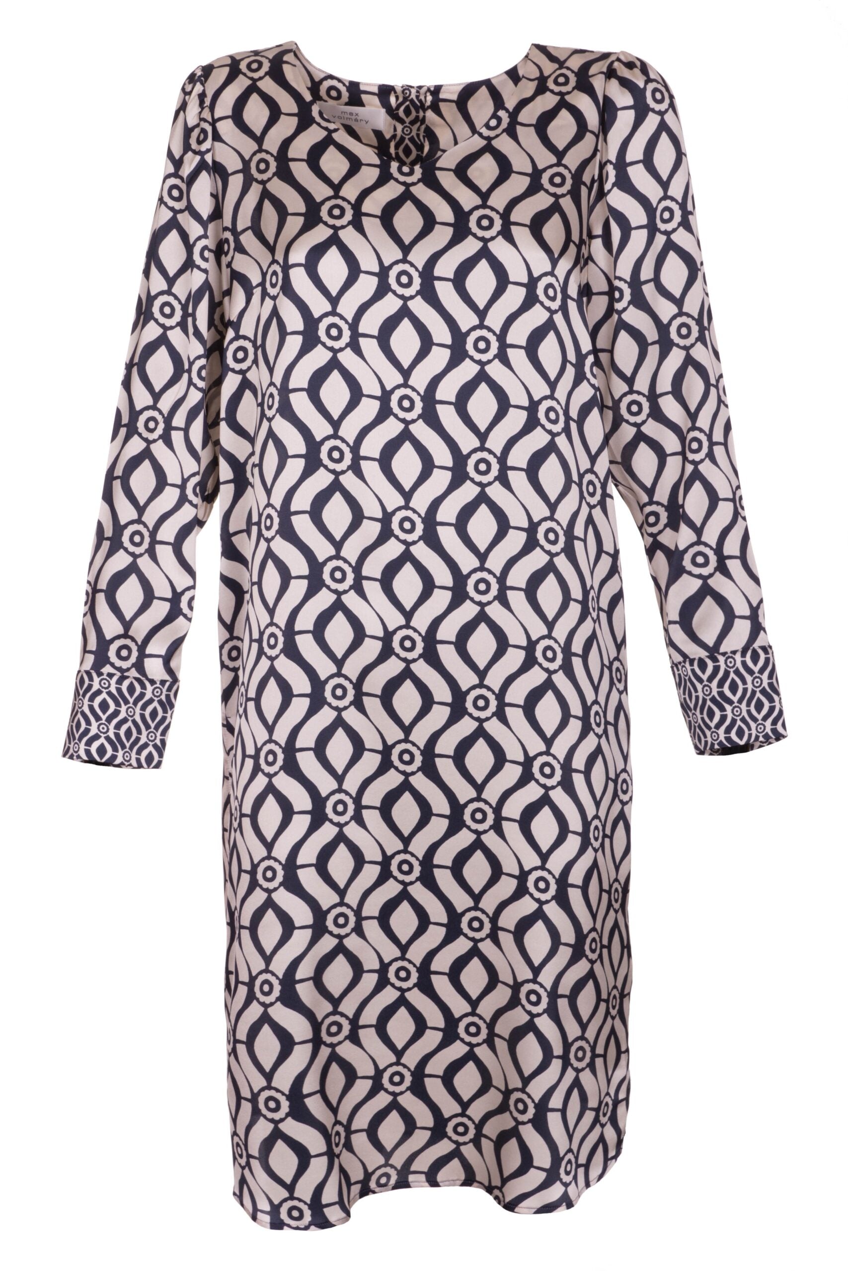 Dieses sportlich elegante Seidenkleid mit Elasthan-Anteil aus dem Hause Max Volmáry ist ein absoluter Eye-Catcher. Marineblau und beige bilden ein super Match! Max Volmáry ist für seine wunderschönen Seidenprints bekannt. Die Qualität und der Sitz machen seine Kleider und Blusen so beliebt.