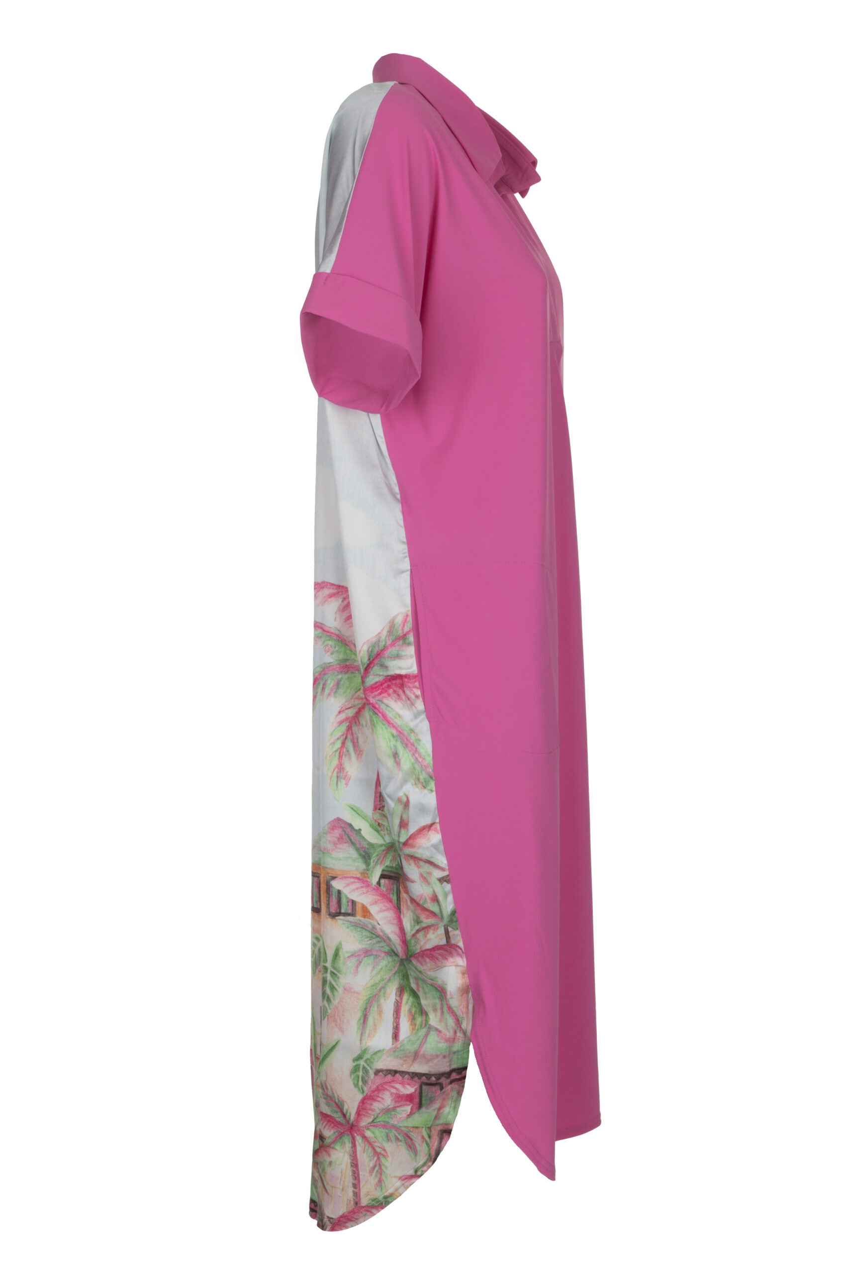 Vorne präsentiert sich das Kleid in cleanem Uni-Look mit modernem V-Ausschnitt und Hemdkragen, während die Rückseite mit karibischen Prints für einen Wow-Moment sorgt. Motive wie Palmen, Oldtimer, florale Illustrationen oder Retro-Schriftzüge entführen dich visuell auf eine tropische Reise.